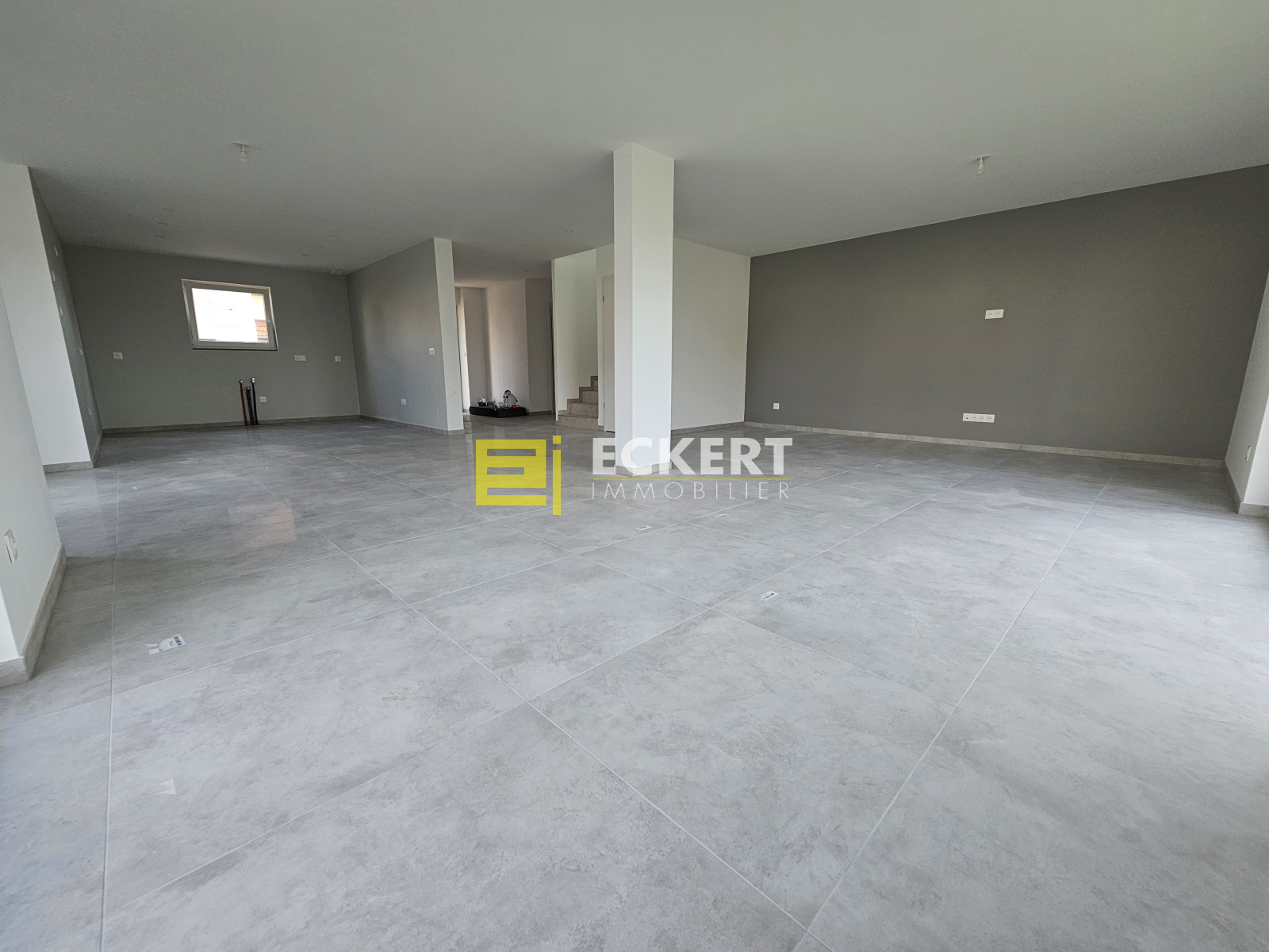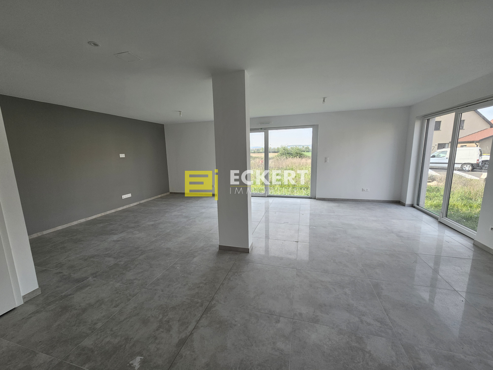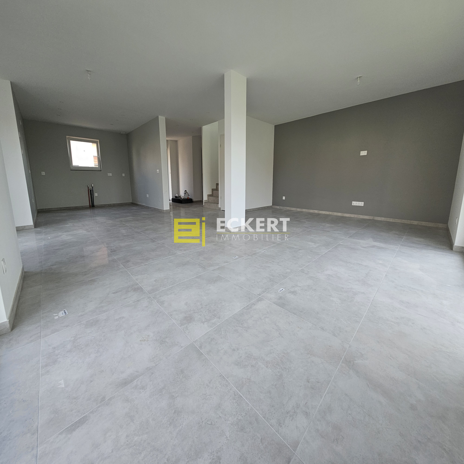 Une pièce de vie lumineuse avec salon, salle à manger et espace prévu pour une cuisine ouverte (à aménager par vos soins),