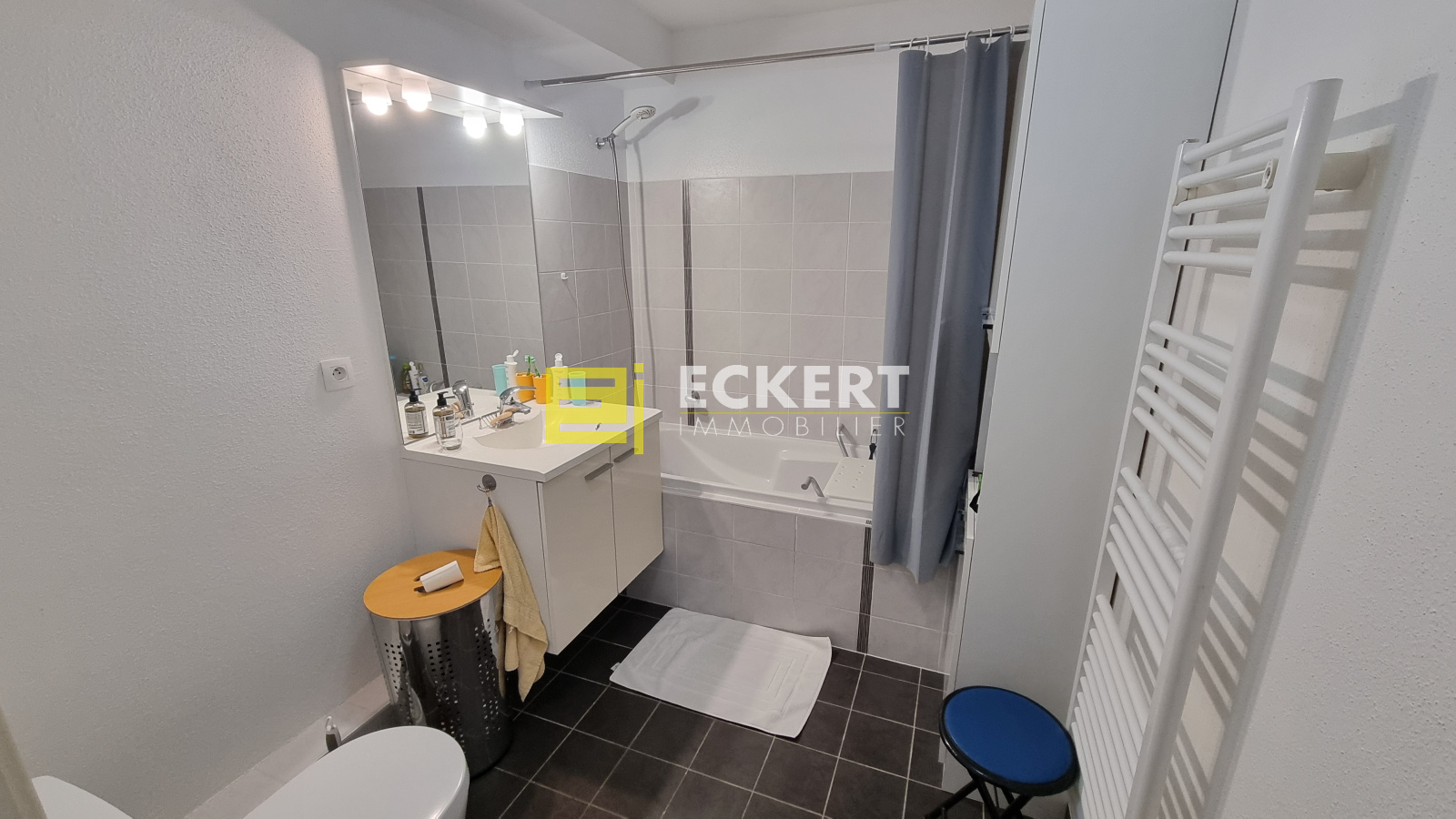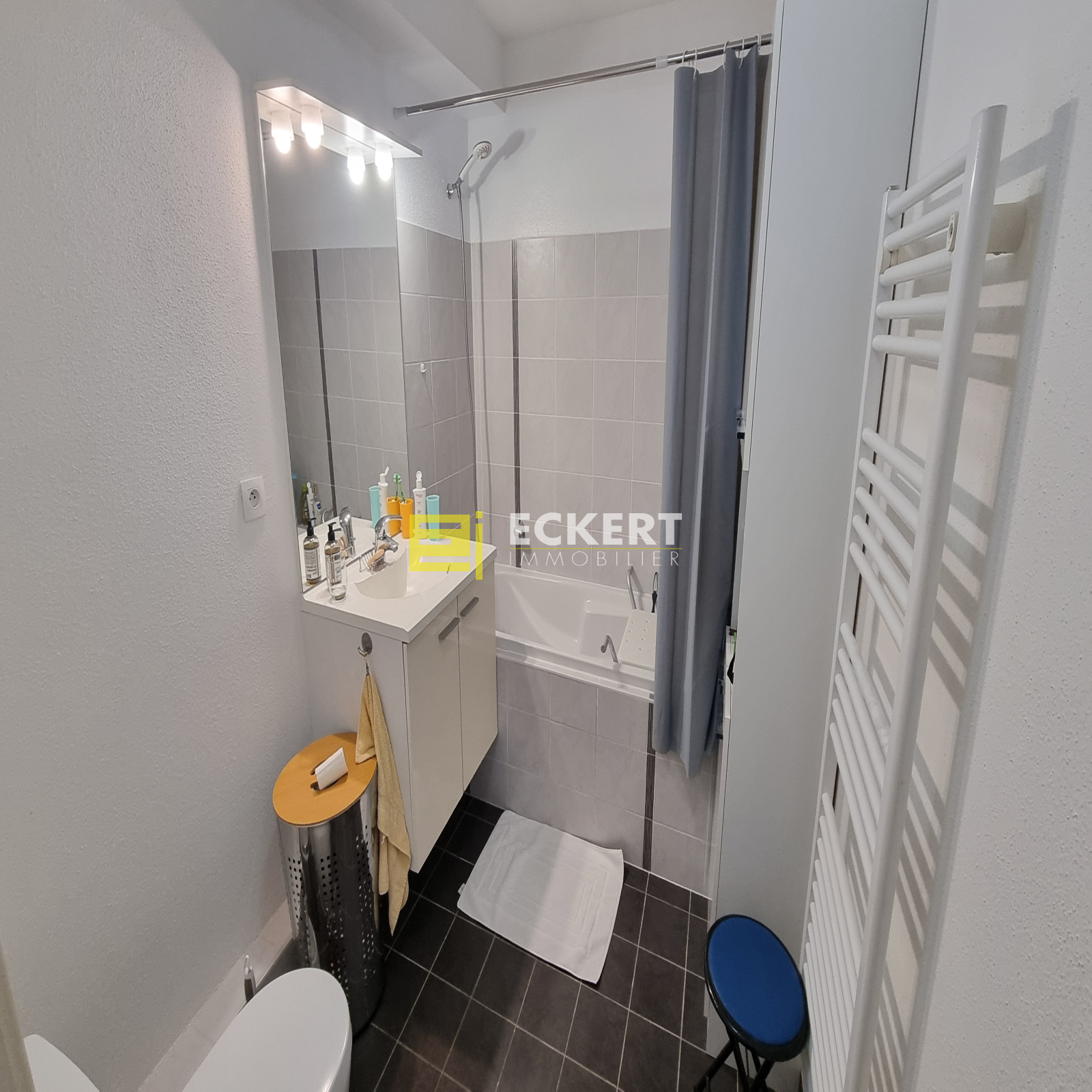 Salle de bain avec baignoire, WC, sèche-serviette et VMC