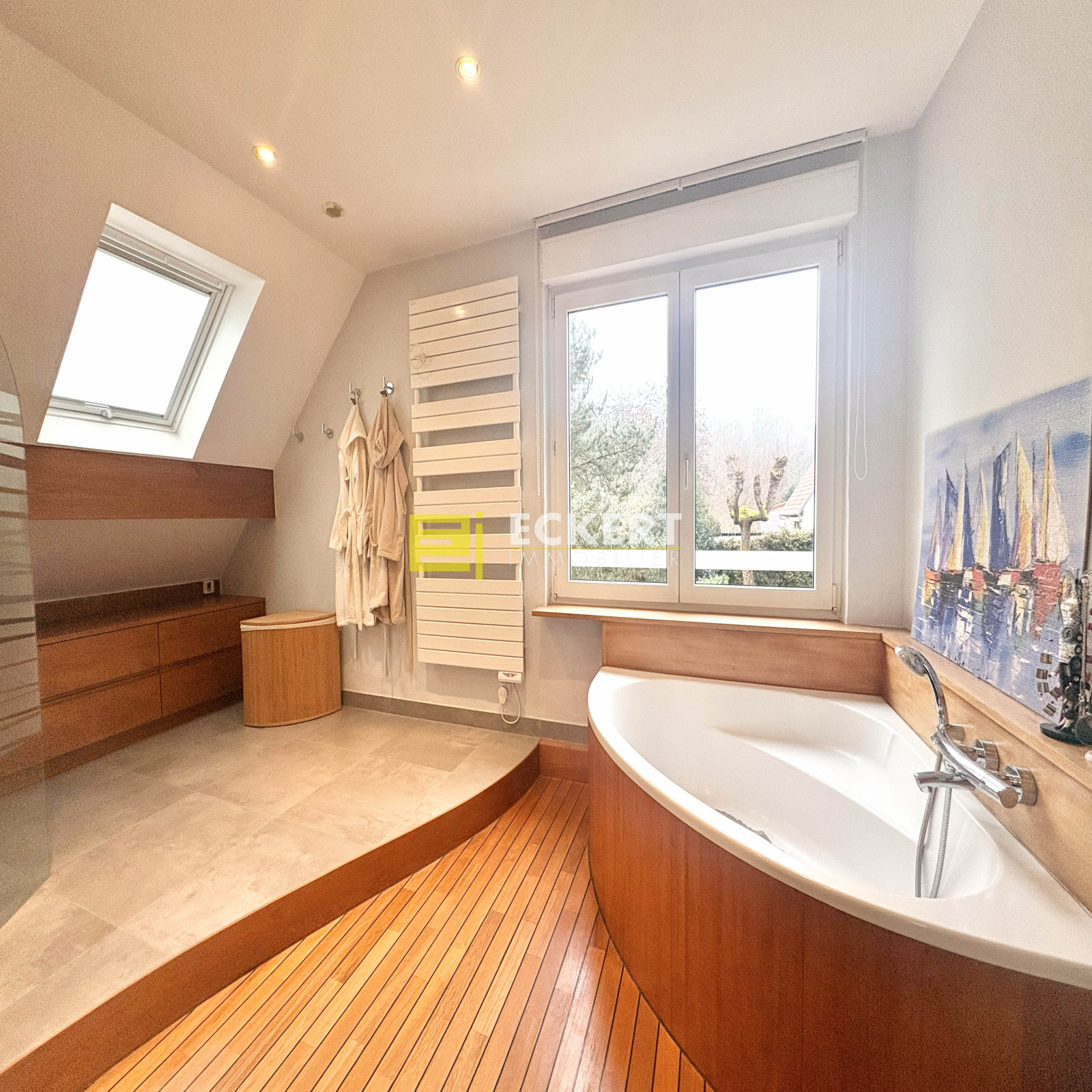 - au rez-de-chausée : 1 entrée avec vestiaire sur mesure, 1 bureau, 2 chambres avec dressing, 1 salle de bain spacieuce (baignoire) + douche à l'Italienne, 1 WC séparé avec rangement.