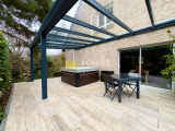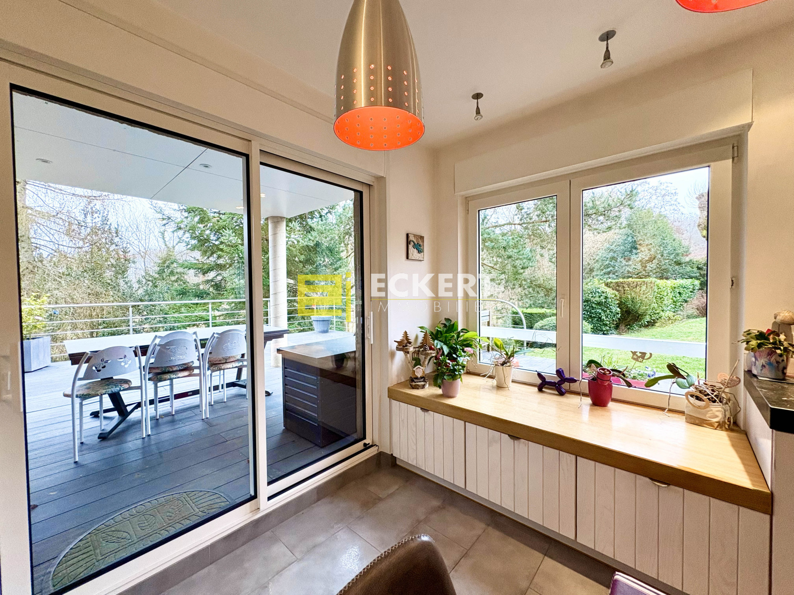 - en rez-de-jardin : 1 salon + cheminée avec accès direct 1 terrasse, 1 salle à manger avec accès direct à 1 seconde terrasse (SPA + pergola), 1 cuisine équipée ouverte sur 1 terrasse sur élevée, 1 espace cellier et buanderie, 1 WC séparé avec rangement et lave-mains.